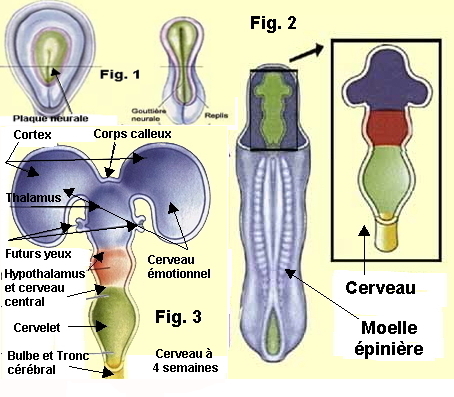 Durant cette troisième semaine on voit apparaître au milieu du foetus, ce qu'on appelle une plaque neurale, qui se “fend” dans le sens de la longueur et se ferme peu à peu. (figure 1), la tête se formant ensuite autour du haut de la plaque qui sera le cerveau, alors que le reste de la plaque donnera naissance au système nerveux périphérique. (figure 2). Au début de la quatrième semaine le haut de cette plaque se divise en cinq parties qui donneront peu à peu naissance aux diverses parties importantes du cerveau que j'ai décrites dans d'autres articles. (figure 3).
